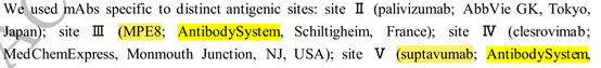 文章引用了AntibodySystemAnti-HRSV-A F/Fusion glycoprotein F0 Antibody (MPE8)(货号RVV02814)(靶向位点III)和Research Grade Suptavumab(货号DVV02807)(靶向位点V),用于竞争ELISA测定血清中相应位点的ESA浓度。实验发现位点III与位点II、IV抗体水平高度正相关(r=0.84、0.75),位点V抗体与多数RSV亚型的中和活性显著相关,表明位点V和Ø抗体虽浓度较低但功能贡献突出,应作为疫苗和单抗开发的关键靶标。
