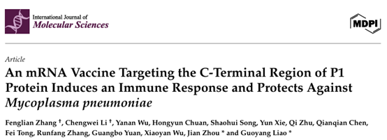 本研究构建并评价了一种针对肺炎支原体(Mycoplasma pneumoniae)P1蛋白C端(aa 1288–1518)的mRNA疫苗mRNA-SP+P1。三剂肌肉免疫后,该疫苗在BALB/c小鼠体内诱导了高滴度P1特异性IgG和显著的CD4+/CD8+效应记忆T细胞反应;血清可显著抑制标准株ATCC M129对KMB17细胞的黏附,并减轻ATCC M129及耐药ST3株攻毒后的体重下降、体温波动、肺部菌载及病理损伤,且保护效果可持续至加强后62天。转录组分析进一步证实疫苗在分子水平激活了免疫相关通路,提示其为应对支原体感染及耐药株传播的新型候选疫苗。