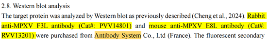 文章引用了AntibodySystemAnti-Monkeypox virus/MPXV F3L Polyclonal Antibody(货号PVV14801)和Mouse Anti-Monkeypox virus/MPXV E8L Antibody (SAA0285)(货号RVV13201)。用于Western blot实验,分别检测经PDX或对照处理的MPXV感染VeroE6与HaCaT细胞中病毒F3L和E8L蛋白的表达水平。结果显示,PDX以剂量依赖方式显著降低两种病毒蛋白的表达,从而证实PDX能有效阻断病毒蛋白合成,进一步支持其抑制MPXV复制的结论。