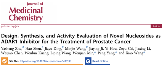 本文基于2-氯腺苷骨架设计合成了系列新型核苷类衍生物,系统评价其抗前列腺癌活性,发现化合物C12对多种前列腺癌细胞(IC50 0.72–1.79 μM)具有强效抑制作用;机制研究证实C12通过高亲和力结合ADAR1(Kd=140nM)抑制其介导的RNAA-to-I编辑,进而下调GLI1等关键基因,诱导细胞周期阻滞与凋亡;小鼠异种移植模型进一步显示C12安全且显著抑制肿瘤生长,提示其为潜在的ADAR1抑制剂用于前列腺癌治疗。