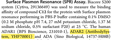 文章引用了AntibodySystemRecombinant Human ADARB1 Protein, N-His(货号YHF70001)用于在表面等离子共振(SPR)实验,将其与ADAR1、ADA等蛋白共同固定在CM5芯片上,测试化合物C12的结合特异性;结果显示C12仅对ADAR1有显著结合(Kd = 140 nM),而与ADAR2和ADA无明显相互作用,从而确认其选择性靶向ADAR1的结论。