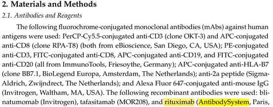 文章引用了AntibodySystemResearch Grade Rituximab (Cat. No. DHC90705),用于与blinatumomab、CD19-CART细胞等作比较的对照实验实验中将rituximab与其他三种制剂共同加入CD19+肿瘤细胞/效应细胞共培养体系,通过Annexin-V/PI流式检测24h后肿瘤细胞凋亡率,并用ELISA及42-plex芯片测定培养上清中IFN-γ、TNF-α、IL-6等细胞因子水平。结果显示,rituximab本身无直接细胞毒性,而CD19-ReTARGTPR在杀伤效率与rituximab无活性的背景下仍与CAR-T/BiTE相当,却显著降低了细胞因子风暴(100–400倍下调),所以CD19-ReTARGTPR可在rituximab无效的情况下实现高效低毒杀伤,优于传统抗CD19疗法。