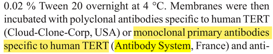 文章引用了AntibodySystemAnti-TERT Antibody (R2T86)(货号RHA28703)用于Western blot实验,以验证端粒酶蛋白表达变化。结果显示angiogenin或联合处理组在8–32h后出现约35kDa及63kDa的特异性TERT条带,而hDNAgr单独处理组未检测到TERT蛋白;该结果与实时PCR中angiogenin组TERT mRNA上调的现象一致,从而证实angiogenin通过激活内源性端粒酶活性增加端粒DNA含量,而hDNAgr则通过非端粒酶途径实现端粒延长。